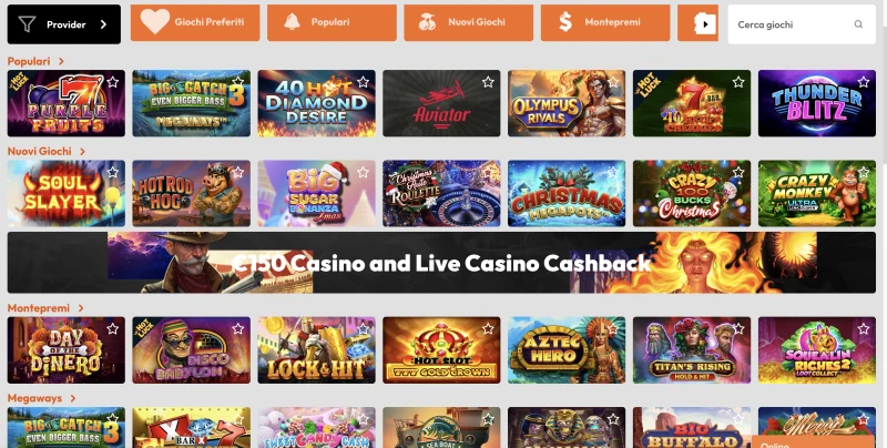 | Cashback Casinò Settimanale (EUR) | 10% di cashback sulle perdite nette | Fino a €150 | Calcolato sulle perdite nette; regole e periodo sono spiegati nell’offerta |